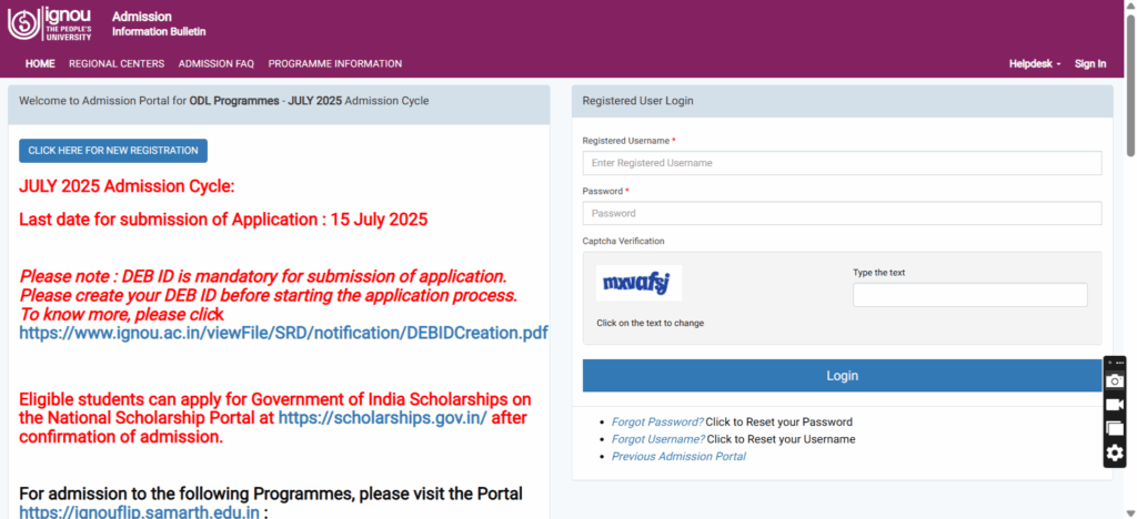This is the starting point of your IGNOU journey. Whether you’re taking fresh admission into a new program or re-registering for the next semester or year, this is the portal you need to use.